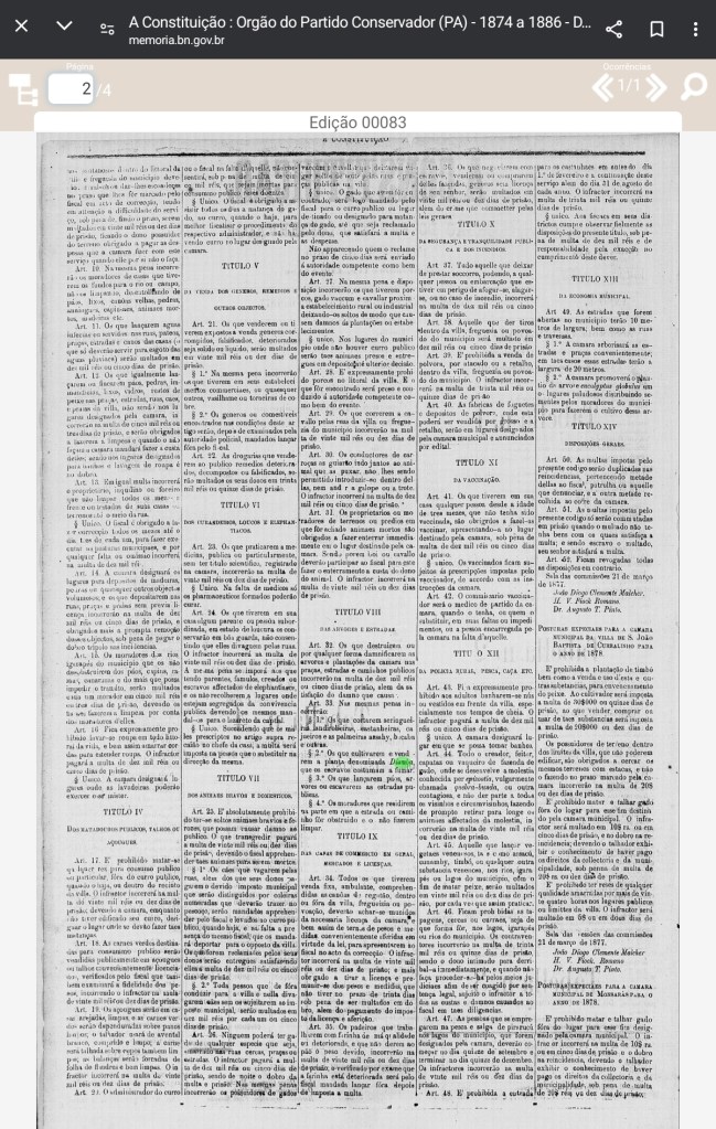 Quase quarenta anos depois desta lei, o município de Alenquer, localizado na Região do Baixo Amazonas paraense, distante 800 km da capital Belém, deliberou e aprovou o seu código de posturas e no ano de 1877, os jornais paraenses A Constituição, o Jornal do Pará e o O Liberal do Pará publicaram na íntegra o Código de Posturas do Município de Alenquer que foi aprovado em 21 de março deste ano e no Título VIII que versa “das árvores e estradas” há a proibição, sob pena de multa de dez mil réis ou cinco dias de prisão, para aqueles que “cultivarem e venderem a planta denominada diamba, que os escravos costumam a fumar” (A Constituição, 1877. Ed. 83, p.1; Jornal do Pará, 1877. Ed. 116, p.1; O Liberal do Pará, 1877. Ed. 119, p.2).
